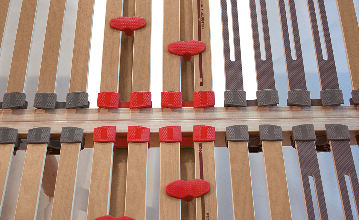 Многослойная система с двумя 38-мм планками, закрепленными внутри края рамы. Система настройки жесткости плечевой зоны
