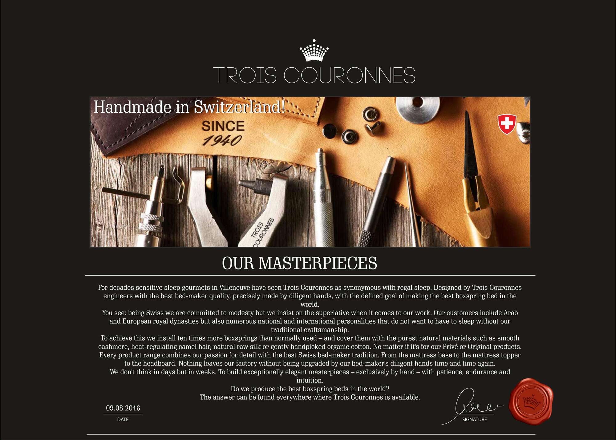 Основание Trois Couronnes - спроектировано и произведено в Швейцарии с самыми жесткими и строгими критериями прочности, надежности, длительности использования. Его конструкция гарантирует эргономичность и большую износостойкость и стабильность матрасу. Благодаря продуманной конструкции - основание не будет скрипеть и издавать звуки во время эксплуатации на протяжении всего срока эксплуатации. Также, оно не имеет ограничений по нагрузке, что позволяет предоставлять фабрике Trois Couronnes пожизненную гарантию на спальную систему (комплект: основание + матрас).