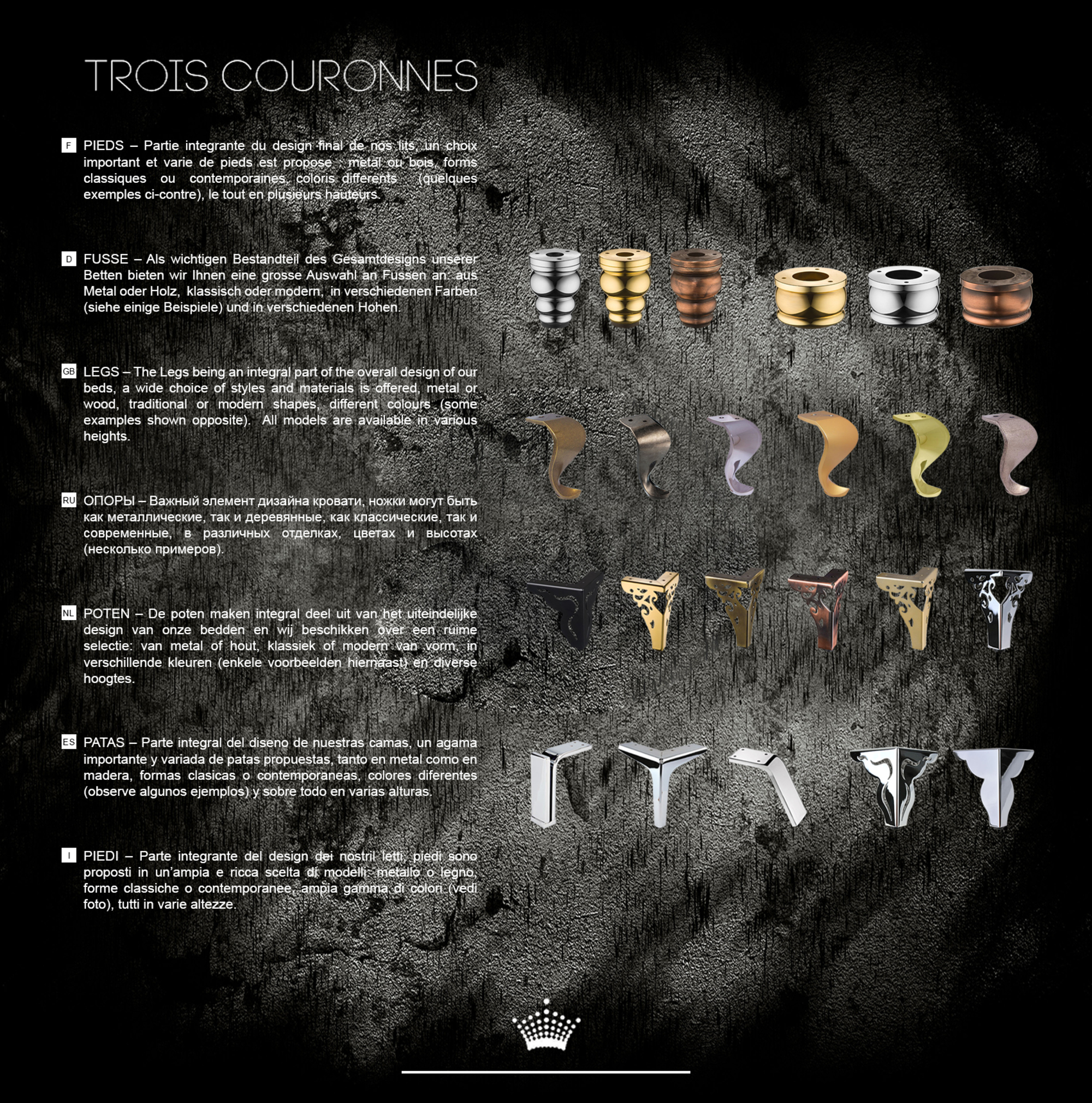 Подчеркнуть великолепие спальной системы Trois Couronnes помогут ножки, идеально подходящий под интерьер и стиль жизни аристократов мира. Выбирая дизайн и цвет ножек - основание кардинально изменяет свою стилевую напрвленность и вписывается в самые разные интерьеры, будь то современная классика или что то другое. Деревянные ножки могут быть представлены в разных вариантах и с разными отделками: натуральное дерево, красное дерево, эбеновое дерево и сталь. Широкая гамма изысканных и натуральных материалов может быть дополнена бронзой, такой модной в 2018г. или хромированной отделкой.