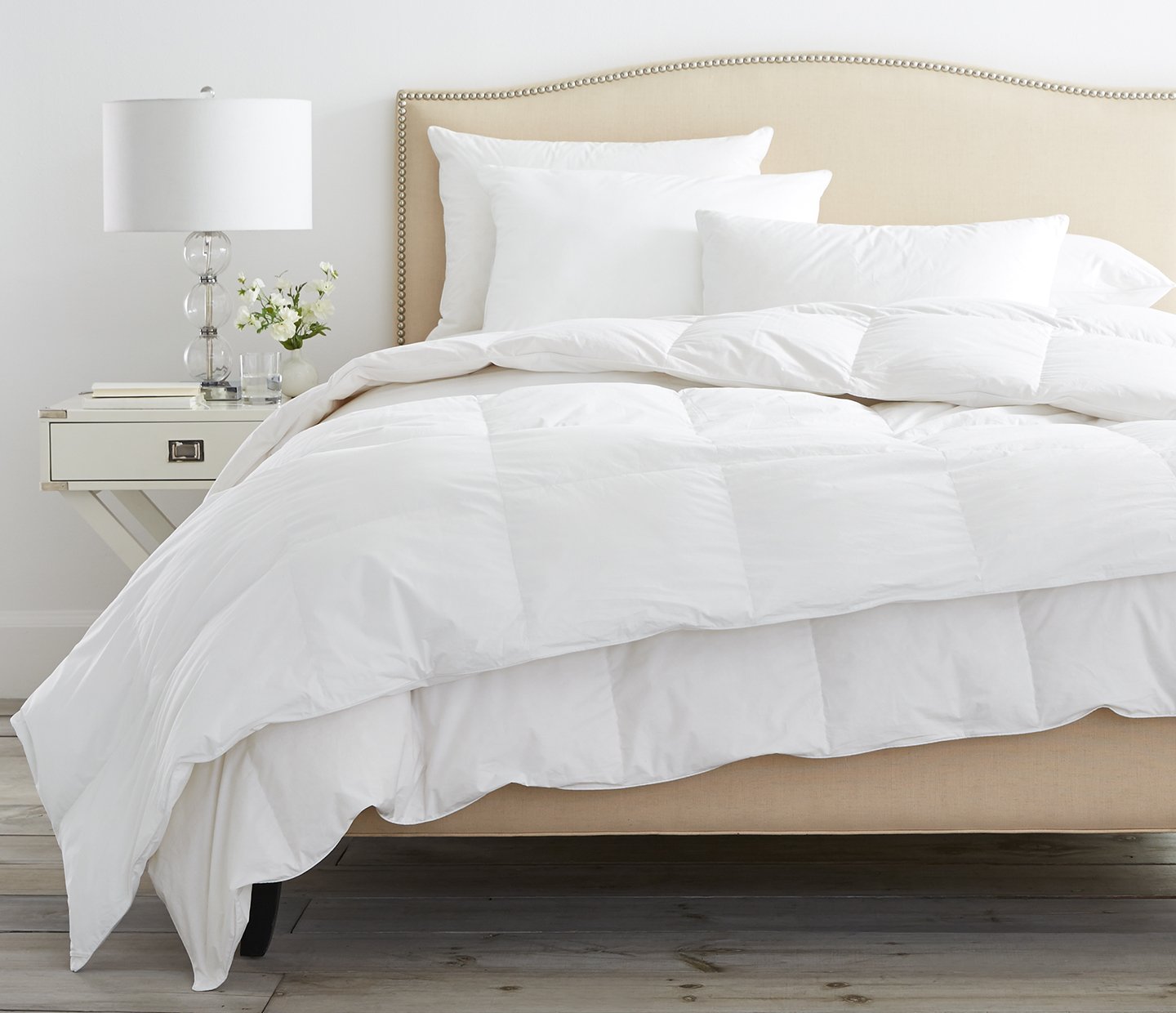 Ткань: 100% хлопок тонкий батист, обработка «softtouch» (135), TC 329, 96 г. м/2, цвет белый, с двойным 6мм швом, Наполнитель: 100% новый чистый белый мазурский гусиный пух 154 г. м/2, класс 1, CUIN 700, сертификат РДС