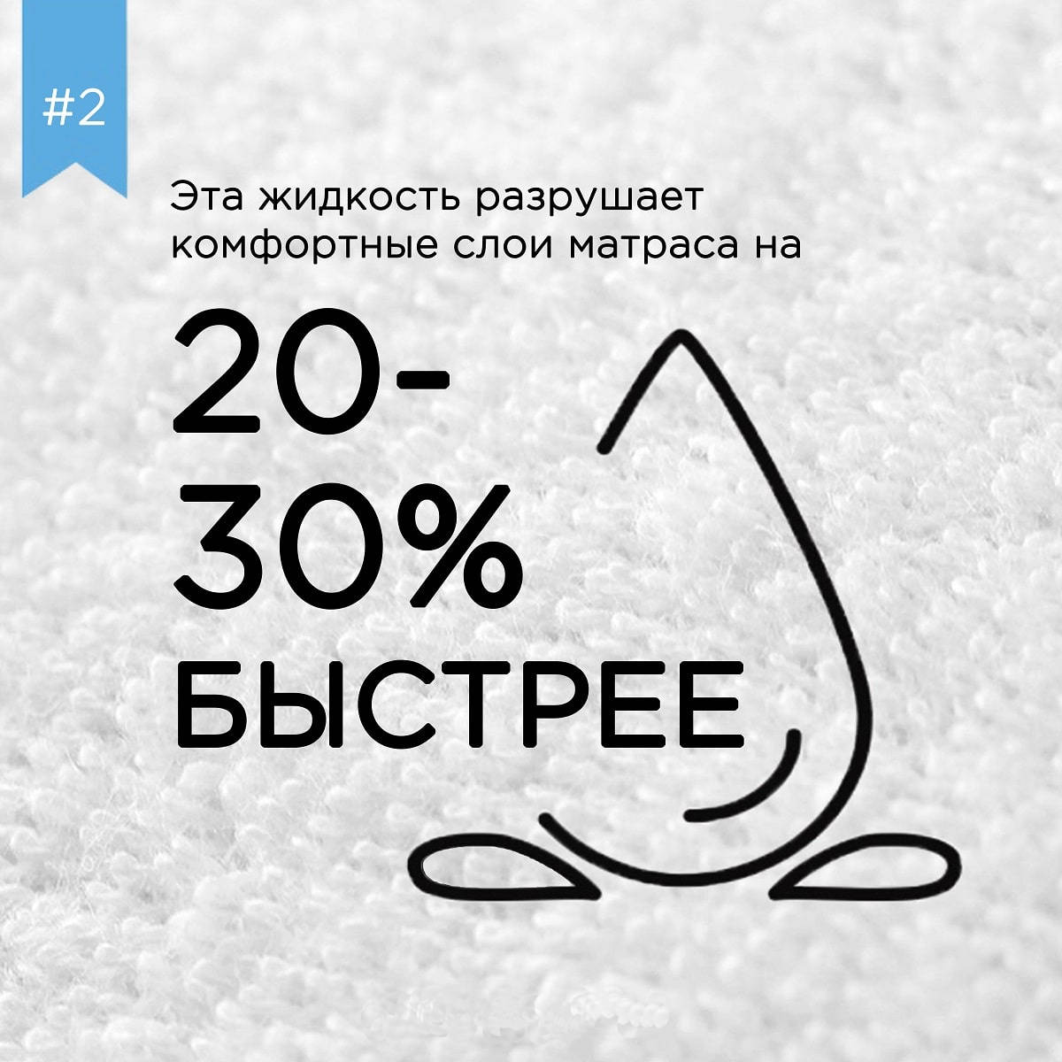 Матрас защищён от всевозможных неожиданностей, связанных с жидкостью: не страшно опрокинуть чашку с чаем или разлить сок. Это достигается за счёт внешней, махровой стороны чехла, которая за счёт состава имеет оптимальную толщину и может впитывать большое количество влаги, не позволяя пролитой жидкости растекаться по всему матрасу.