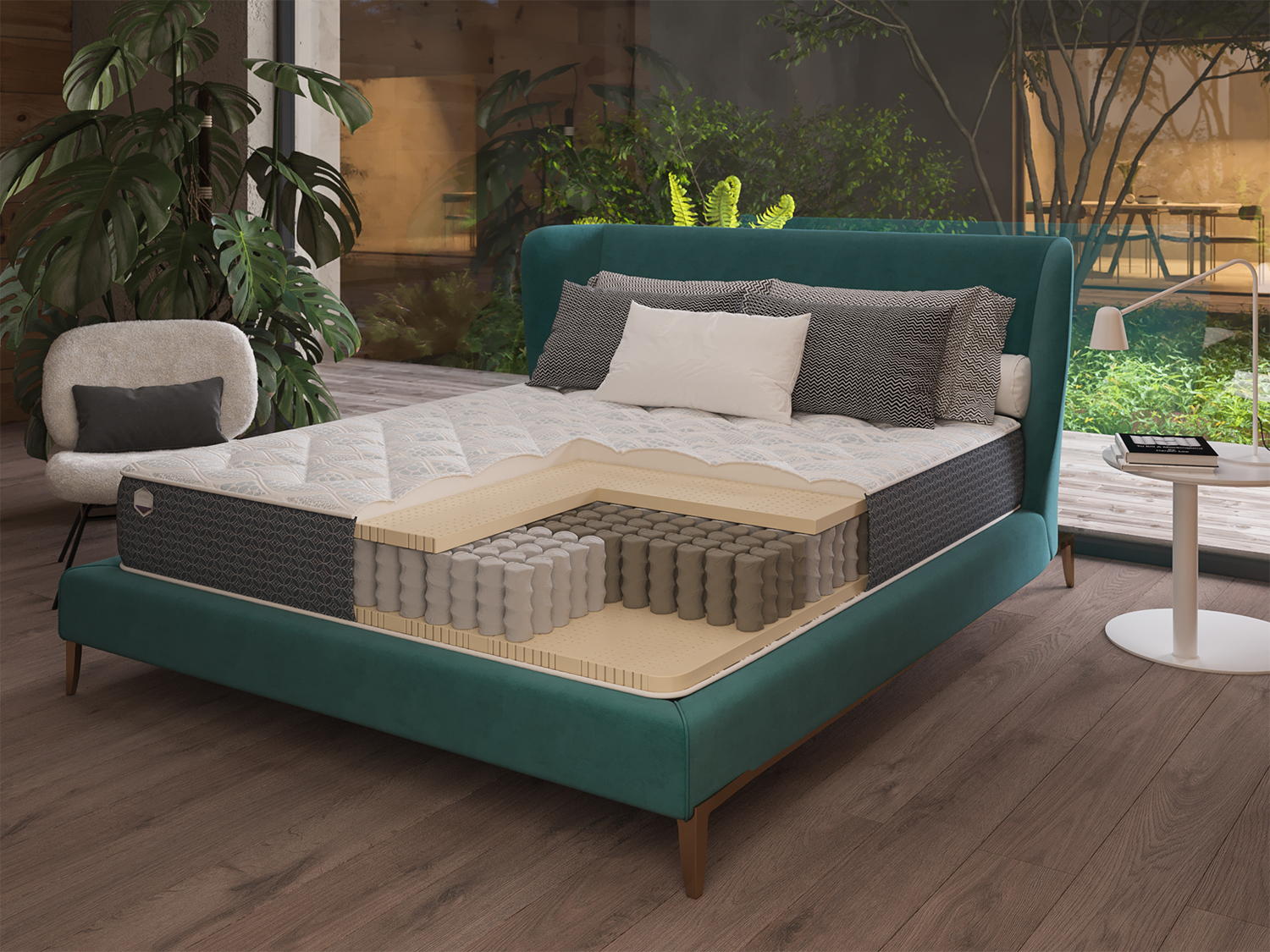 В основе - материалы последнего поколения без свинца и формальдегидов: базовый слой - независимые пружины минипакет (1428 пружин на 1 спальное место) высотой 14 см., натуральный латекс с одной стороны и анатомический слой с микромассажным эффетом (около 4 см.) с другой стороны. Благодаря микро-шипикам - одна сторона матраса лучше вентилируется и ослабляет давление, оказываемое матрасом на тело. Матрас рекомендован людям с заболеваниями кровообращения, варикозным расширением вен и др.