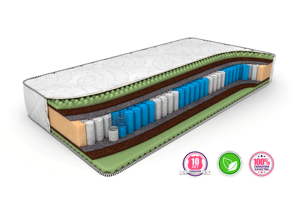 Внешний наполнитель – Ergo Foam – высокоэластичная пена с массажным эффектом и высокой анатомичностью. Внутренний наполнитель – латексированная кокосовая койра, придающая конструкции умеренную жёсткость. Модель смонтирована на современном высокотехнологичном пружинном блоке Smart Zone, усиливающим массажный эффект и позволяющим выдерживать нагрузку до 140 кг на одно спальное место. Изолирующий слой из термовойлока защищает наполнитель от контакта с металлом пружин, продлевая срок эксплуатации матраса. В комплект входит чехол Трикотаж Антистресс – приятная на ощупь трикотажная ткань успокаивающе действует на психику человека и легко пропускает воздух, позволяя телу свободно дышать.