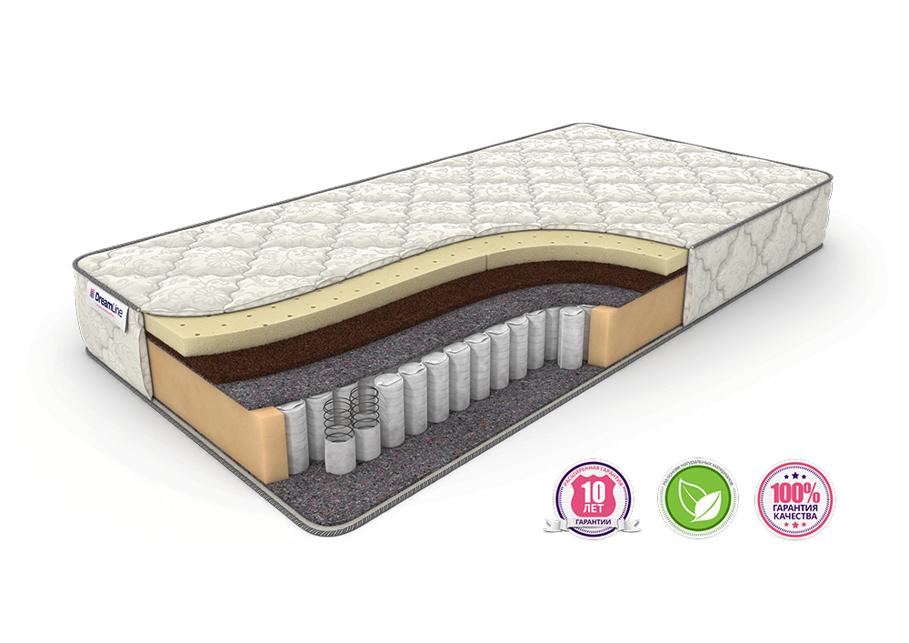 Комфортная поддержка и здоровый сон. Основа конструкции данной модели – независимый пружинный блок TFK, призванный гасить нежелательные колебания поверхности, обеспечивая тем самым крепкий, глубокий сон. Внутренний наполнитель – кокосовая койра, пропитанная латексом, придаёт жёсткость рабочей плоскости матраса и служит надёжной опорой позвоночника. Внешний наполнитель – натуральный латекс – деликатно смягчает жёсткость кокоса, делая отдых более комфортным, не уменьшая при этом ортопедических свойств матраса. Модель Single Dream Medium TFK разработана для людей, ведущих активный образ жизни.