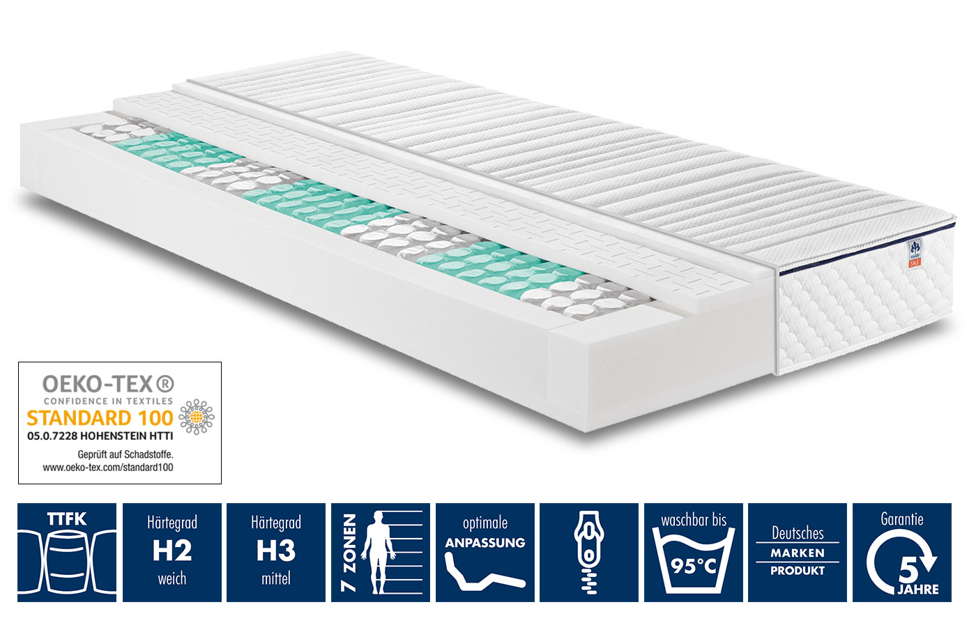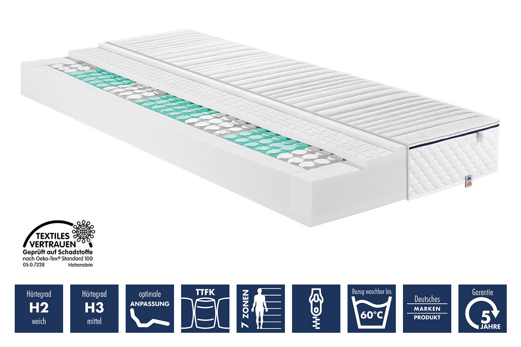 Cердцевина: 500 — бочкообразный пружинный блок карманного типа, с 7-ми зонной эргономичной поддержкой тела с обеих сторон высокоэластичная пена Rhombo-therm (360 пружин в матрасе 90 х 200 см) Общая высота: ок. 22 cм