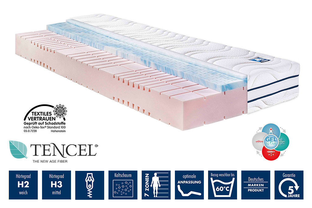 7 зон эргономичной поддержки тела, высокоэластичная пена с настилом из Gel-active; □ комфортная зона плеч для оптимально удобного сна на боку; высокоэластичный настил Gel-active® для идеальной адаптации к телу спящего;