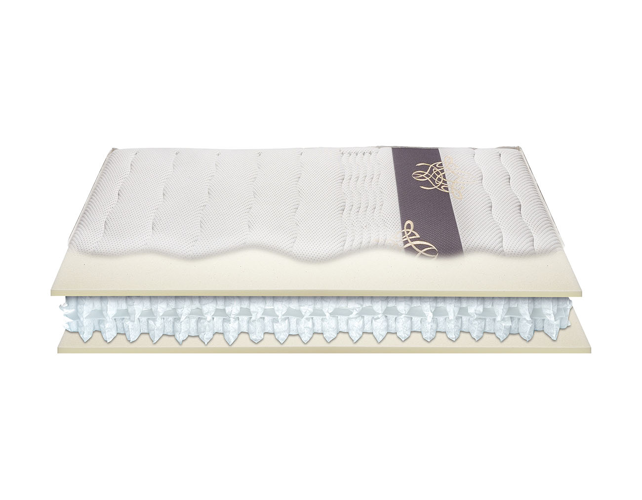 Независимый пружинный блок в основании матраса содержит невысокие изолированные пружины карманного типа (производство ? Германия). Чтобы стабилизировать пружины, увеличить их ортопедические свойства и продлить срок службы, каждый элемент прошел через закаливание и вшит в отдельный чехольчик. Благодаря этому исключена деформация пружин!