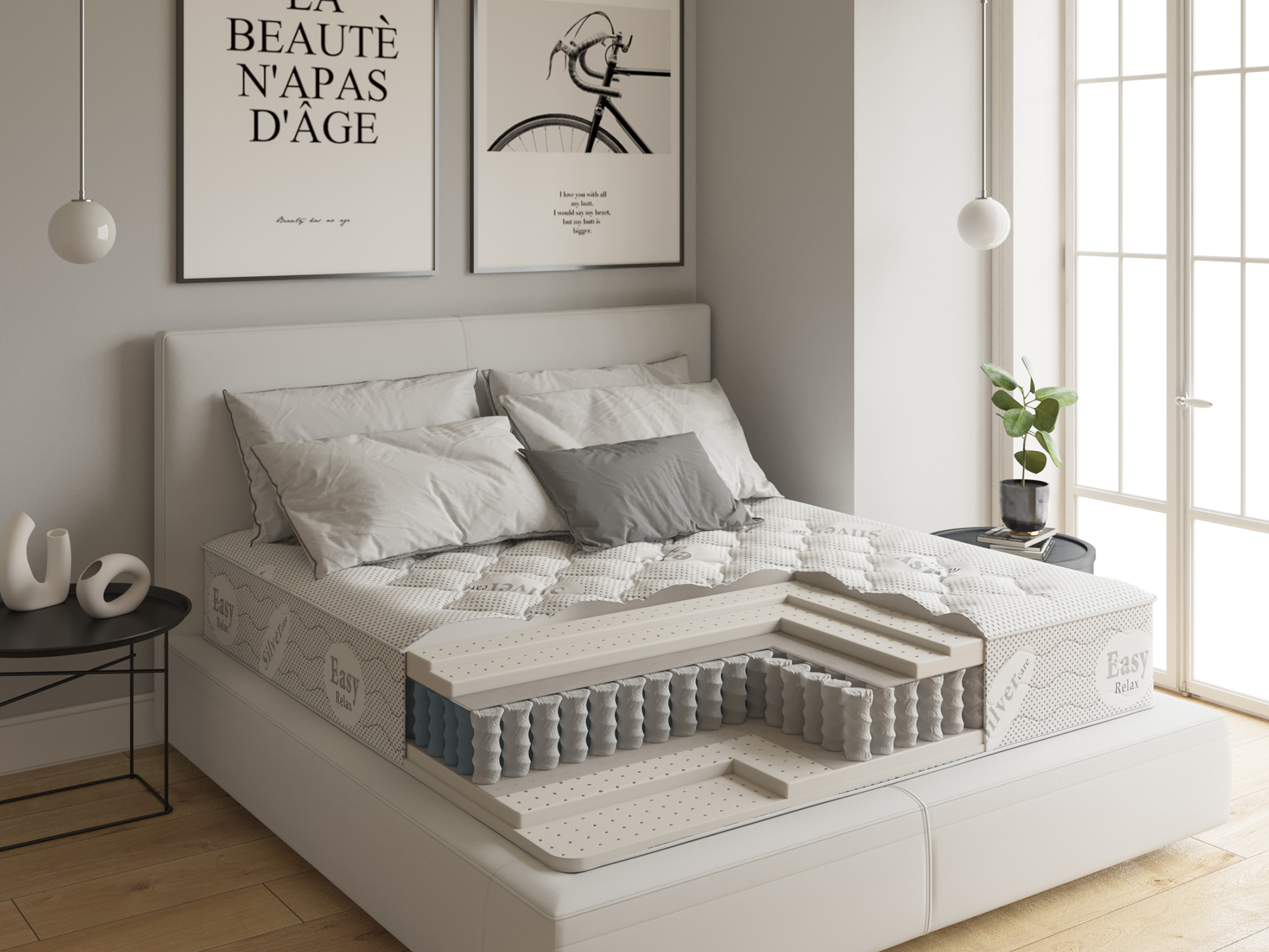 Достаточно высокий и удобный матрас с независимыми пружинами и 100% натуральным латексом, который содержит целых 7 анатомических зон жесткости для оказания оптимального анатомического эффекта. По ощущениям матрас очень мягкий и плюшевый за счет слоев из перфорированного натурального латекса. Слои латекса защищены от протирания пружинами прослойками из войлока. Чехол сделан из хлопкового трикотажа с волокнами шерсти и бамбука. Данная модель прослужит долго благодаря специальному усилению по периметру Easy Seat.