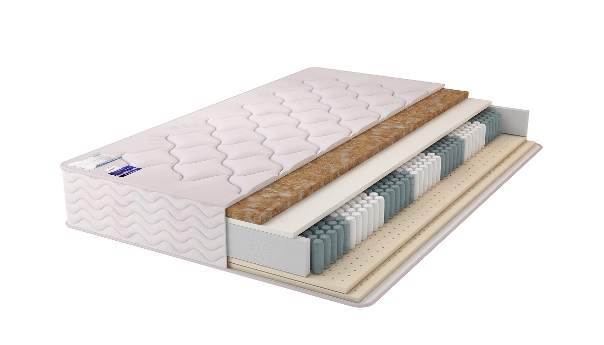 Матрас с жесткой и средне жесткой сторонами. Внутри независимый блок пружин двойной контракции Дуэт, исключающий точечное продавливание и эффект «волны» при разнице нагрузок. С одной стороны два слоя латекса по 2 см для комфортного расслабления мышц и позвоночника. Материал быстро восстанавливает упругость после эксплуатации. С другой стороны — упругий пенополиуретан и кокосовое волокно толщиной 3 см для достижения оптимального ортопедического эффекта.