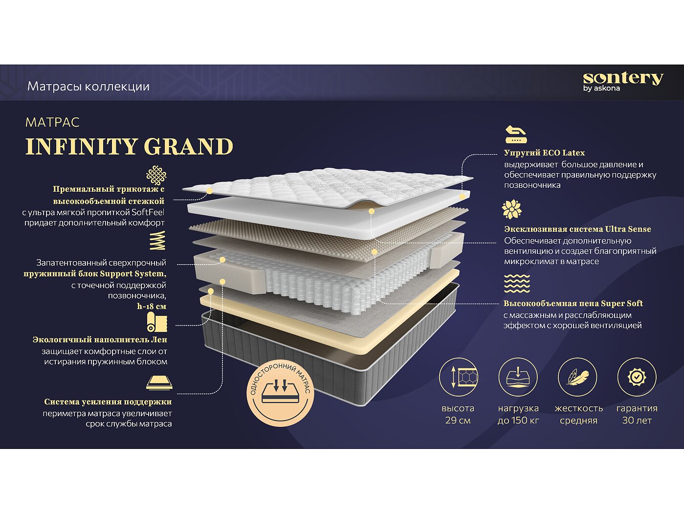 Матрас Sontery Infinity Grand – двусторонняя модель, обе стороны которой средней жёсткости. Это матрас с натуральным латексом и пеной SoyaFoam в составе, которые вместе с блоком независимых пружин создают высокий ортопедический эффект, стабильно поддерживая спину и все остальные части тела в правильном для здоровья положении.