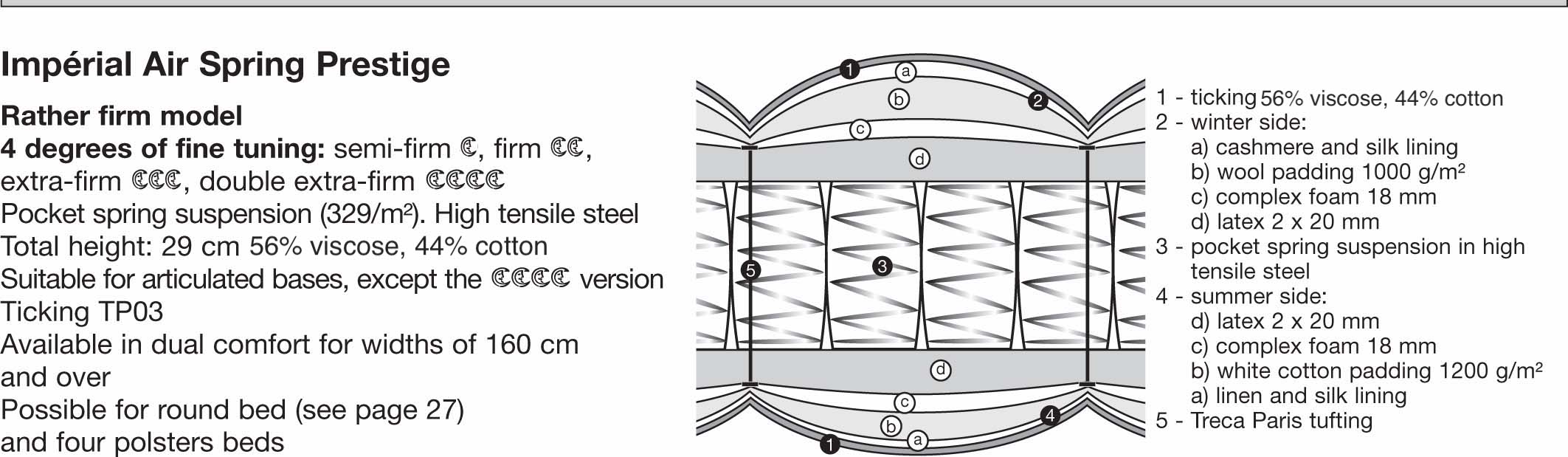 Модель Impérial Air Spring Prestige (IAS Prestige) – флагман линии, ее рессорная система из зачехленных независимых пружин и масса натуральных материалов служат для создания очень комфортабельной опоры как летом, так и зимой.