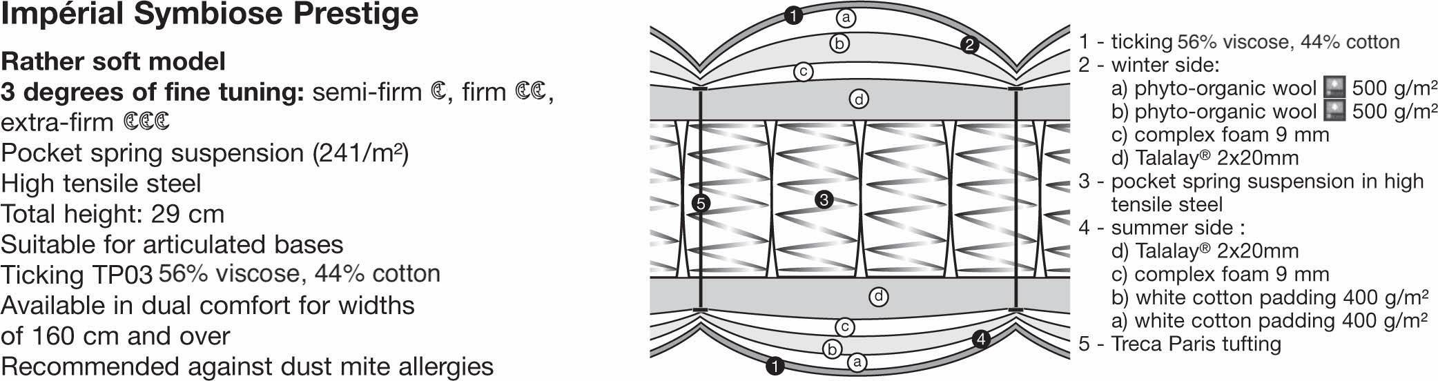 Модель Impérial Symbiose Prestige высокий матрас высотой 29 см., который делает ставку на Talalay, а также на большое количество фитобиошерсти (Phytobiolaine) на зимней стороне и хлопка на летней стороне, чтобы подарить Вам несравненно мягкий комфорт. Рекомендованная модель для аллергиков на бытовую пыль.