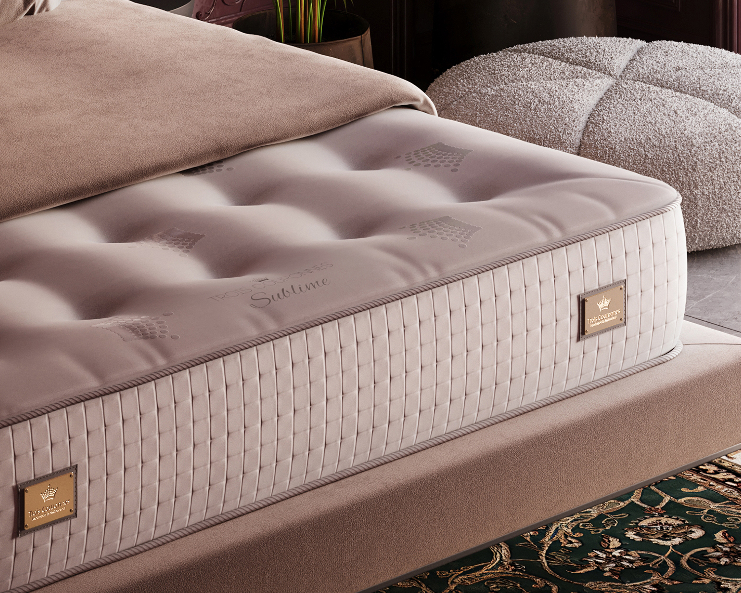 В качестве основы матраса Trois Couronnes Sublime используется уникальная конструкция из двойных независимых пружин Revolution® совместно с системой мини пружин 4000 High Density® диаметром 11 мм и 2000 High Density® диаметром 22 мм, прошедших процесс печной закалки, что обеспечивает защиту от деформации и позволяет производителю давать пожизненную гарантию на пружинные блоки в своих матрасах.