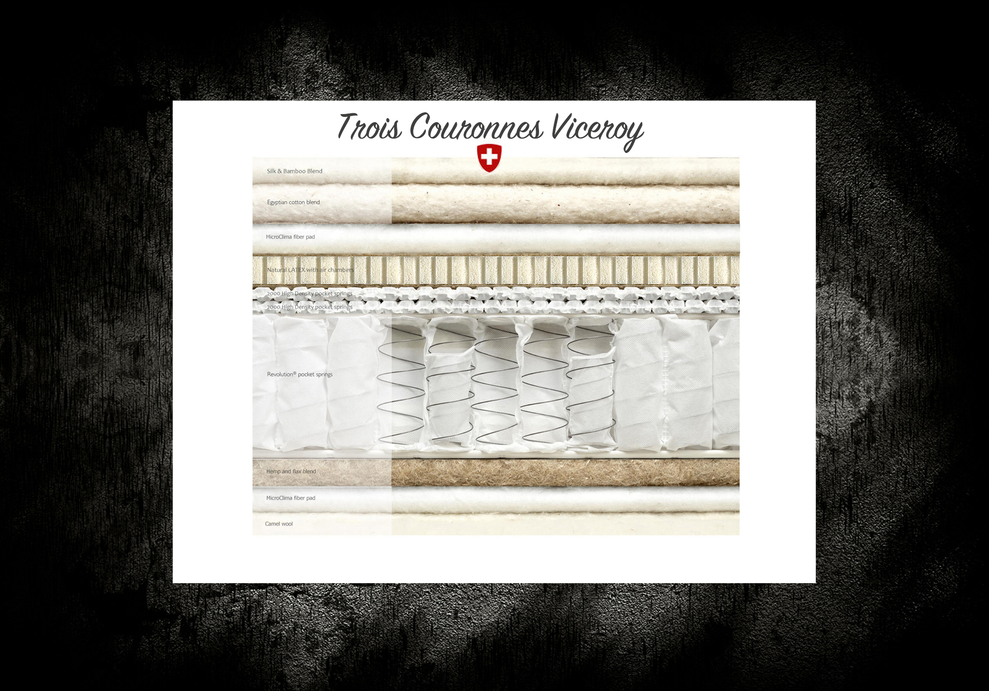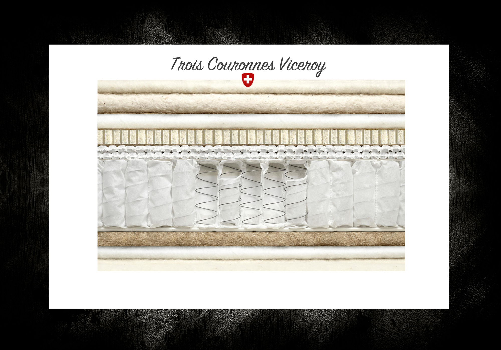 В качестве основы матраса Trois Couronnes Viceroy используется уникальная конструкция из двойных независимых пружин Revolution® совместно с системой мини пружин 2000 High Density® диаметром 22 мм , прошедших процесс печной закалки, что обеспечивает защиту от деформации и позволяет производителю давать пожизненную гарантию на пружинные блоки в своих матрасах.
