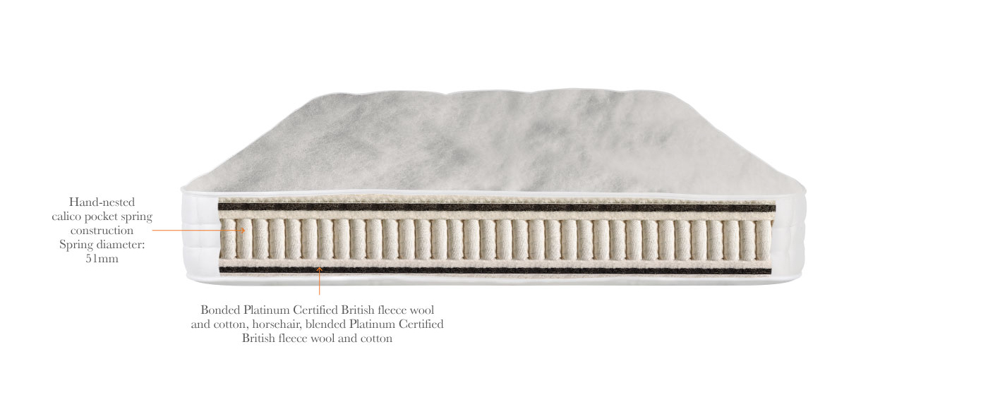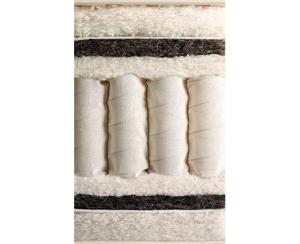 Матрас ручной работы с независимыми пружинами разной жесткости. Его конструкция выполнена на основе уложенных по уникальной технологии пружинных блоков, зашитых в чехлы из коленкора. На матрас размером 182 см х 200 см приходится 1804 пружины. Эксклюзивный натуральный наполнитель: конский волос, смесь британской рунной шерсти, удостоенной Платинового сертификата, и хлопка.