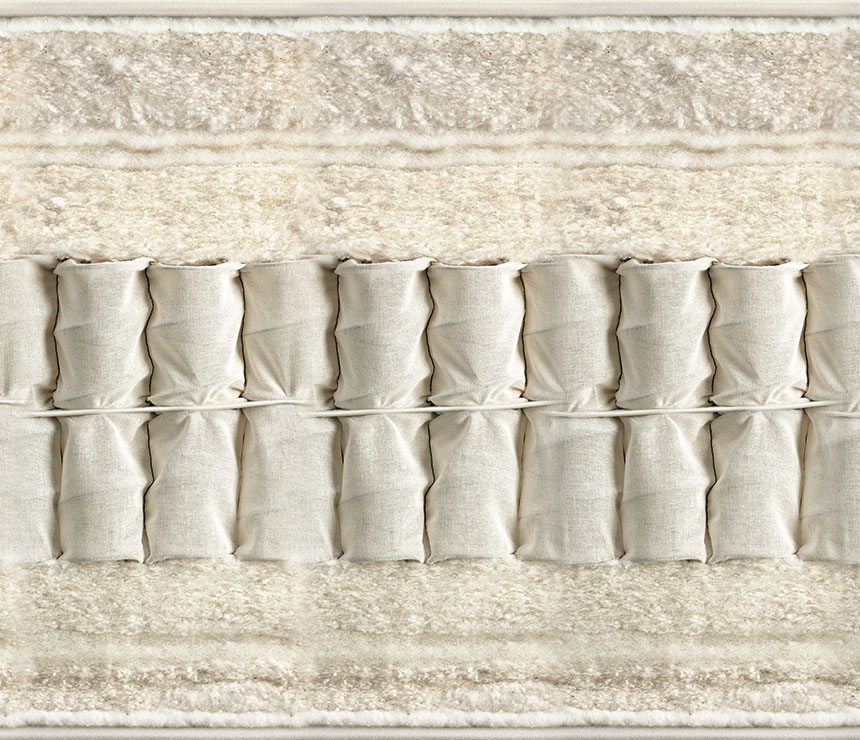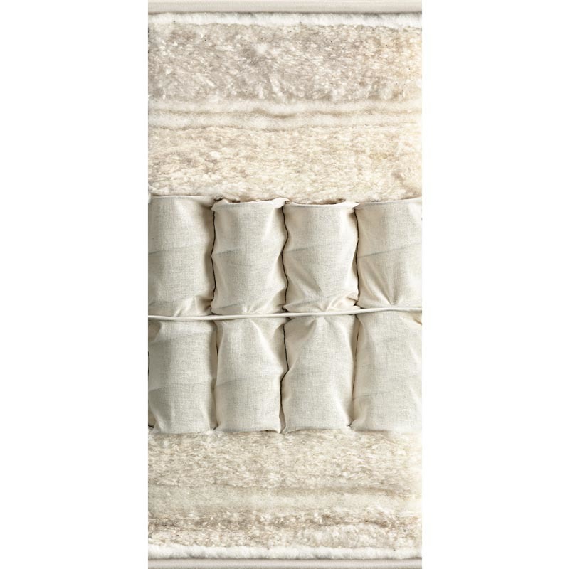 Ортопедический матрас с независимыми пружинами разной степени жесткости. Его конструкция выполнена на основе уложенных по уникальной технологии пружинных блоков, зашитых в чехлы из коленкора. На матрас размером 182 см х 200 см приходится 2720 пружин. Эксклюзивный натуральный наполнитель: смесь настоящей шетландской шерсти, удостоенной Платинового сертификата, и хлопка, шелк тусса. Имеются связанные вручную шерстяные кисточки и бечевка. Края изнутри обтянуты защитным слоем шерсти. Ручной шов втачку в 3 ряда. Удобные горизонтальные ручки для транспортировки.